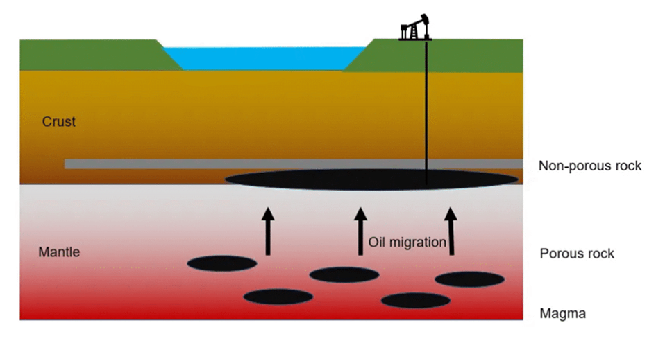 Uhlík přítomný v magmatu pod zemskou kůrou reaguje s vodíkem a vytváří metan a další uhlovodíky, přičemž vzniká mnoho chemicky složitých mezistupňů. Některé minerální horniny, jako je žula a jiné horniny na bázi křemíku, působí jako nevyčerpatelné katalyzátory, které tento proces urychlují.
