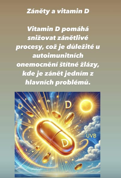 • Vitamin D pomáhá snižovat zánětlivé procesy, což je důležité u autoimunitních onemocnění štítné žlázy, kde je zánět jedním z hlavních problémů.